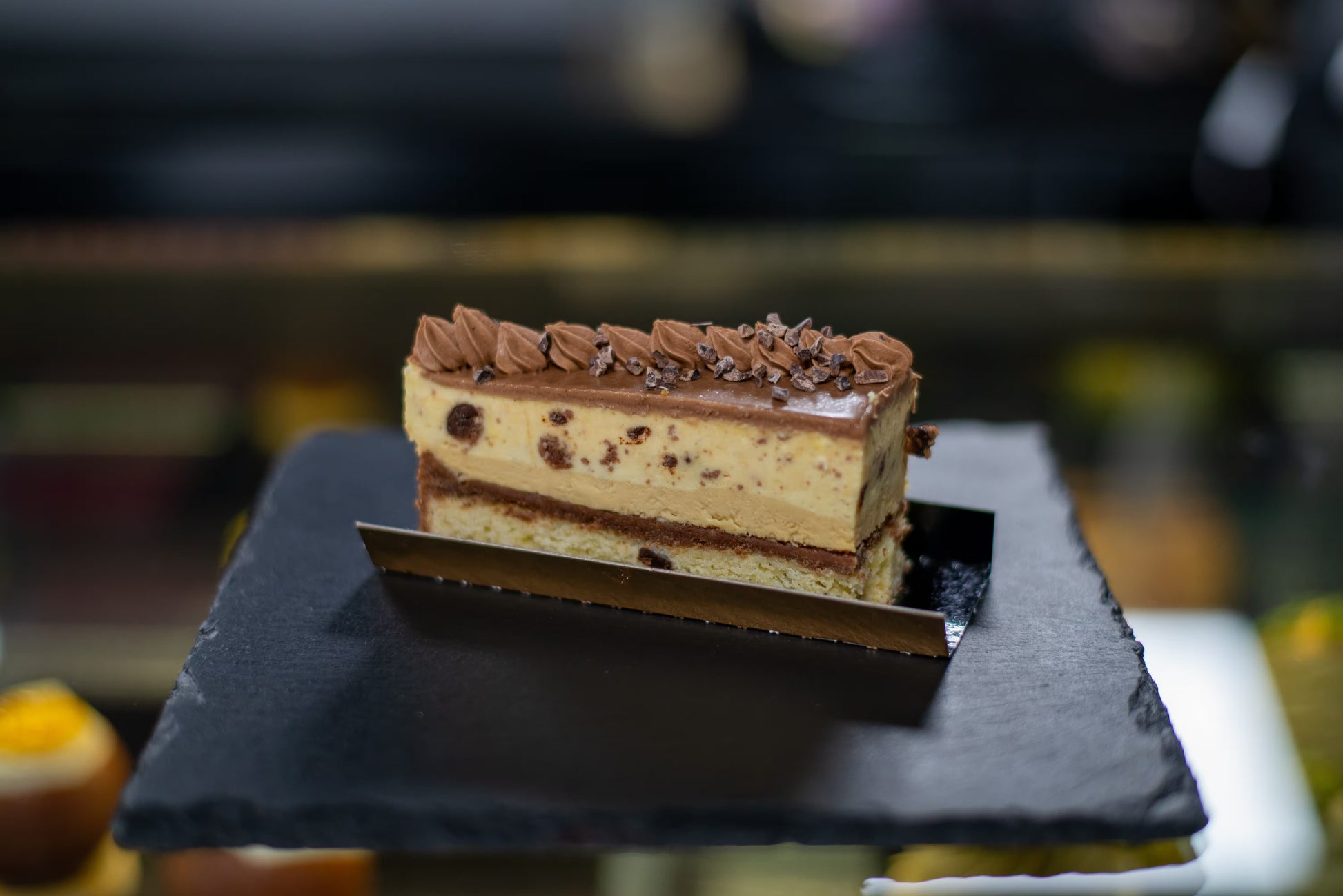 Cookie dessert, un desert cremos cu straturi bogate de ciocolată cu lapte, ciocolată albă și note de caramel, completat de mascarpone, frișcă și bucăți de cookie cu ciocolată, pentru un gust intens, echilibrat și decadent.