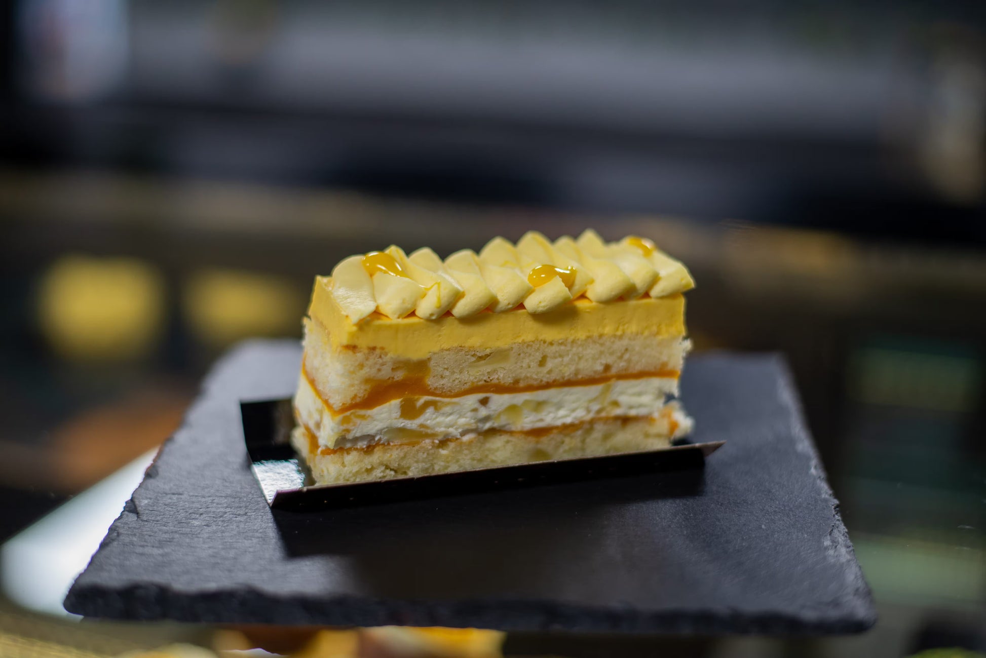 Passion, un desert cremos și fructat, realizat din ouă, smântână și frișcă, cu straturi aromate de mango, ananas și fructul pasiunii, completate de note fine de ciocolată albă și citrice, pentru un gust proaspăt, echilibrat și intens aromat.